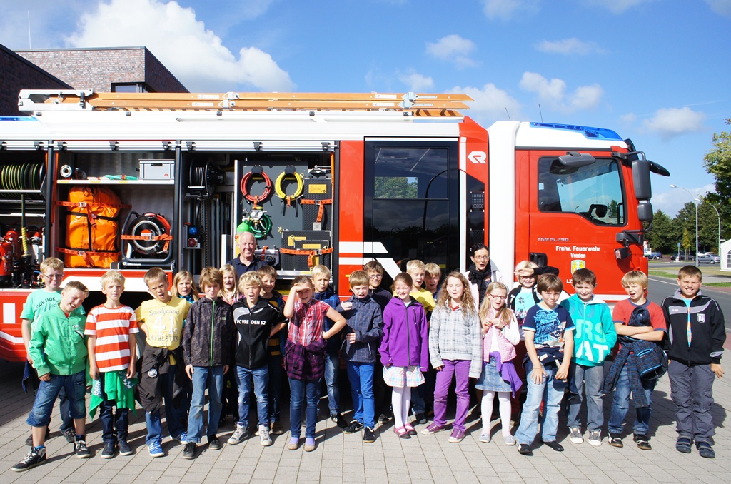 Besuch bei bestem Wetter bekam die Feuerwehr Vreden „Löschzug Stadt“ heute von der Klassse 4d der Norbertschule Vreden mit Ihrer Lehrerin Frau Tenhumberg. Die Kinder hatten sich im Rahmen des Deutsch- und Sachkundeunterrichts mit der Feuerwehr beschäftigt und durften nun einen Blick „hinter die Kulissen“ werfen. Geführt von Andreas Becking wurden alle Räumen und Feuerwehr-Autos besichtigt es konnten viele Fragen gestellt werden.