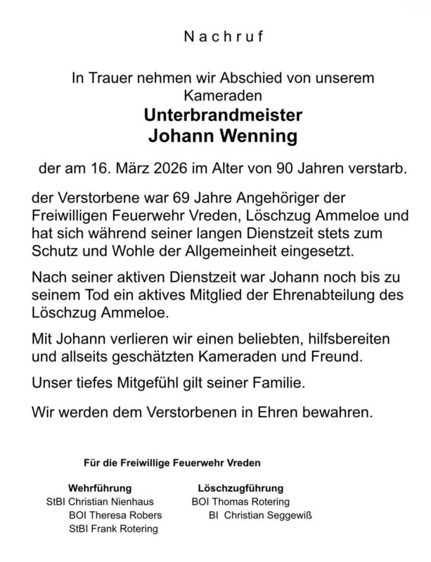 In Trauer nehmen wir Abschied von unserem Kameraden Johann Wenning aus dem Löschzug Ammeloe. 69 Jahre lang stellte sich Johann in den Dienst der Allgemeinheit. Auch nach seiner aktiven Dienstzeit engagierte er sich stets in der Ehrenabteilung. Wir werden ihm ein ehrendes Andenken bewahren.