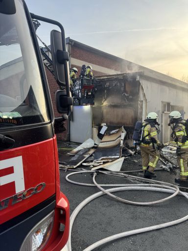 Am 22.12.2025 um 14:57 wurde eine Gruppe des Löschzuges Vreden mit dem Stichwort „Feuer_klein“ zu einem Betrieb auf die Ausbachstraße alarmiert. Bei Eintreffen der ersten Kräfte zeigte sich eine starke Rauchentwicklung im Bereich der Außenfassade. Daher wurde das Stichwort auf „Feuer“ erhöht und der gesamte Löschzug Vreden alarmiert. Vor Ort ging ein Trupp unter schweren Atemschutz mittels C-Rohr in den Anbau vor um den Brandherd ausfindig zu machen. Ein weiterer Trupp stellte eine Riegelstellung ,zu angrenzenden Gebäuden, her. Nachdem eine weiter Ausbreitung verhindert werden konnte, wurde die Drehleiter in Stellung gebracht um die Dachhaut zu kontrollieren. Gleichzeitig wurde die Außenfassade, mittels Rescue-Säge geöffnet, um alle Glutnester abzulöschen.